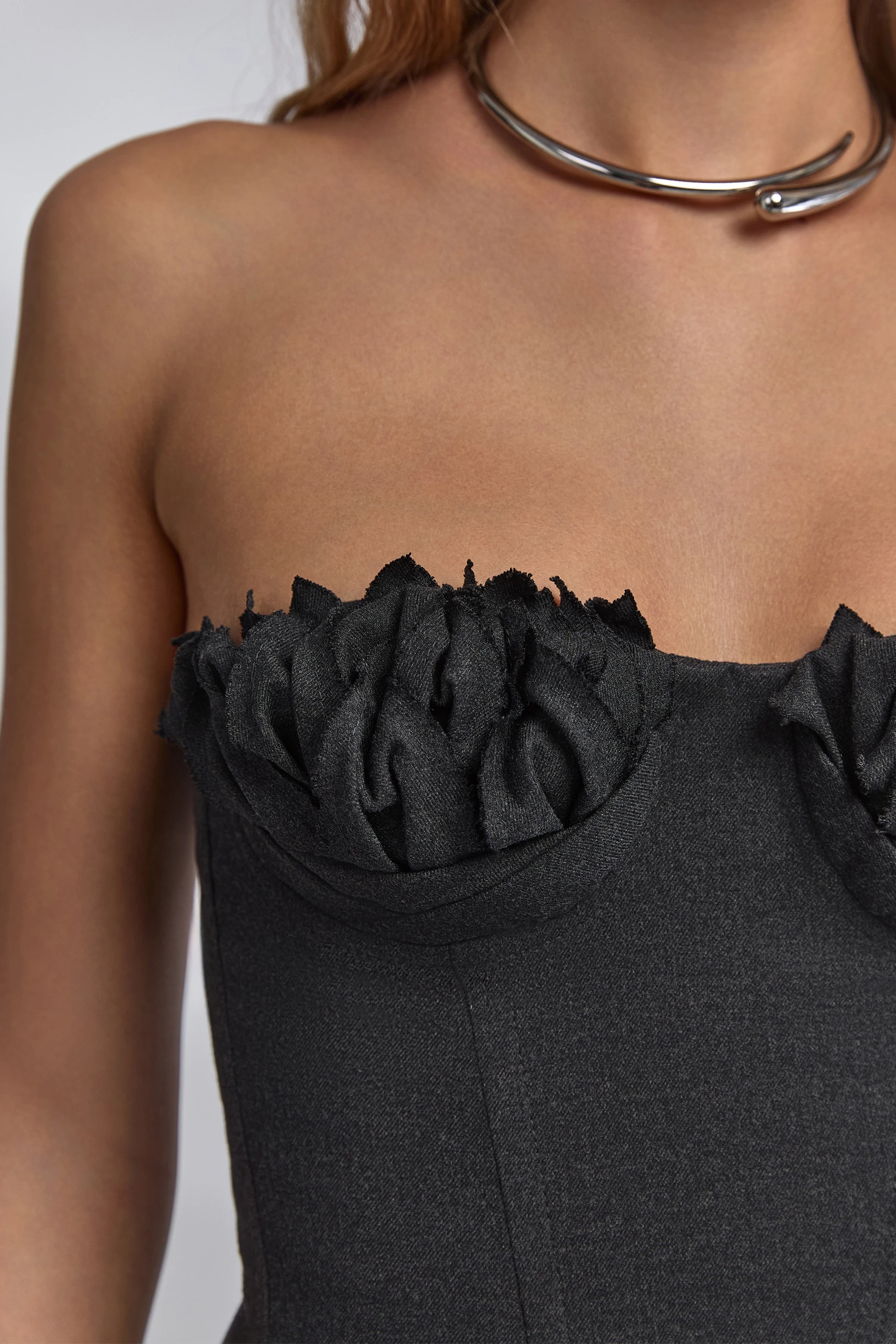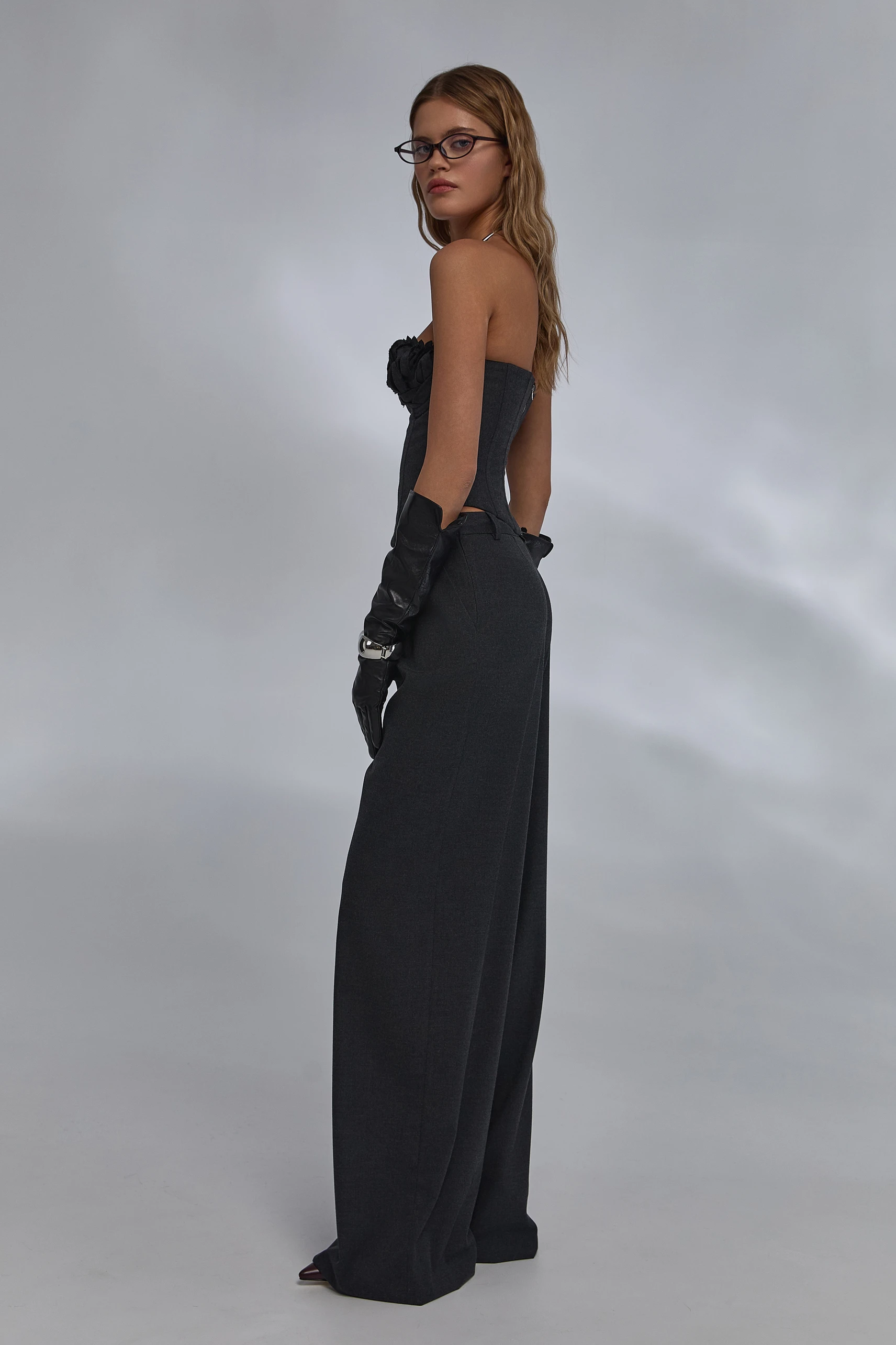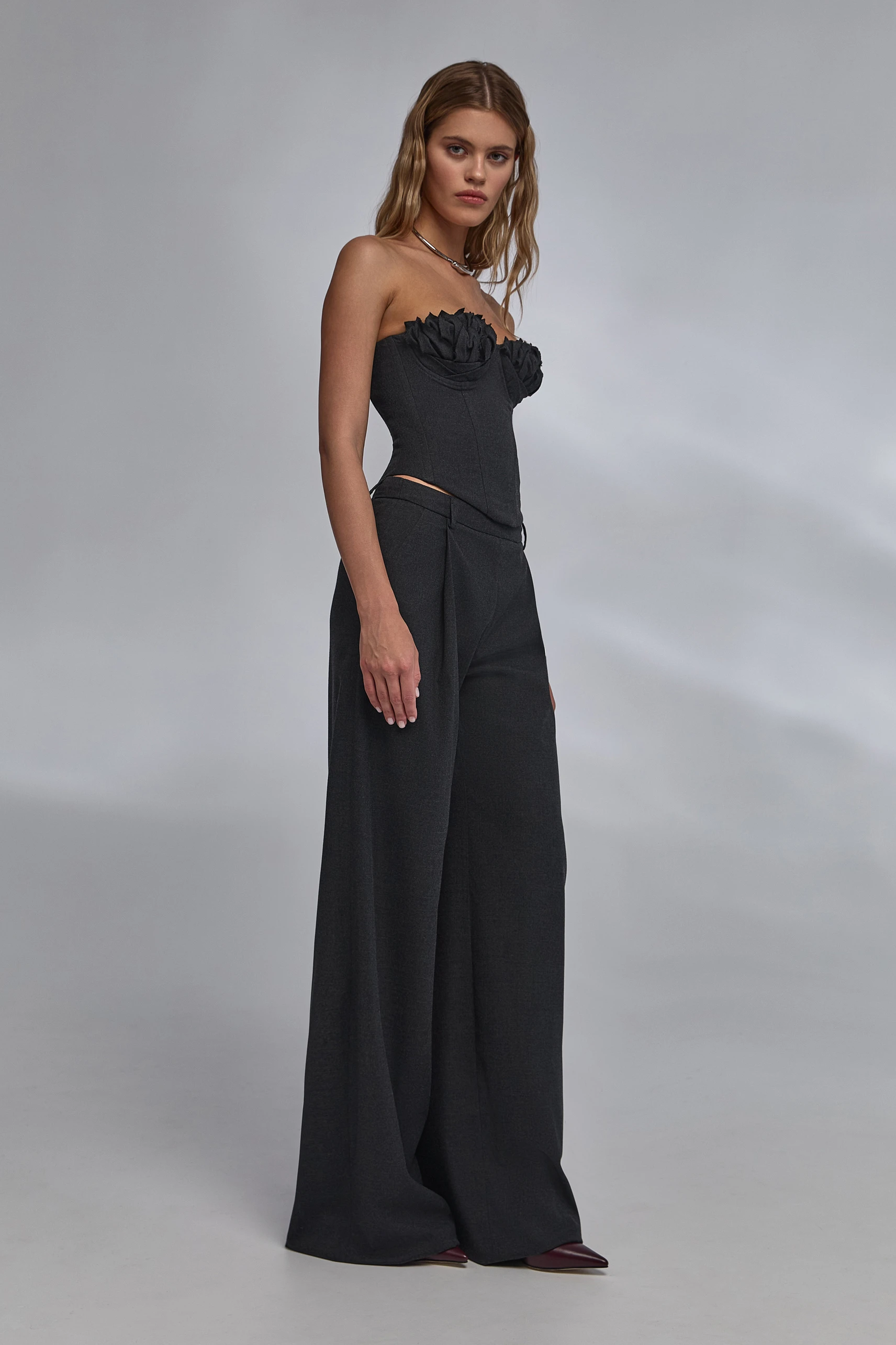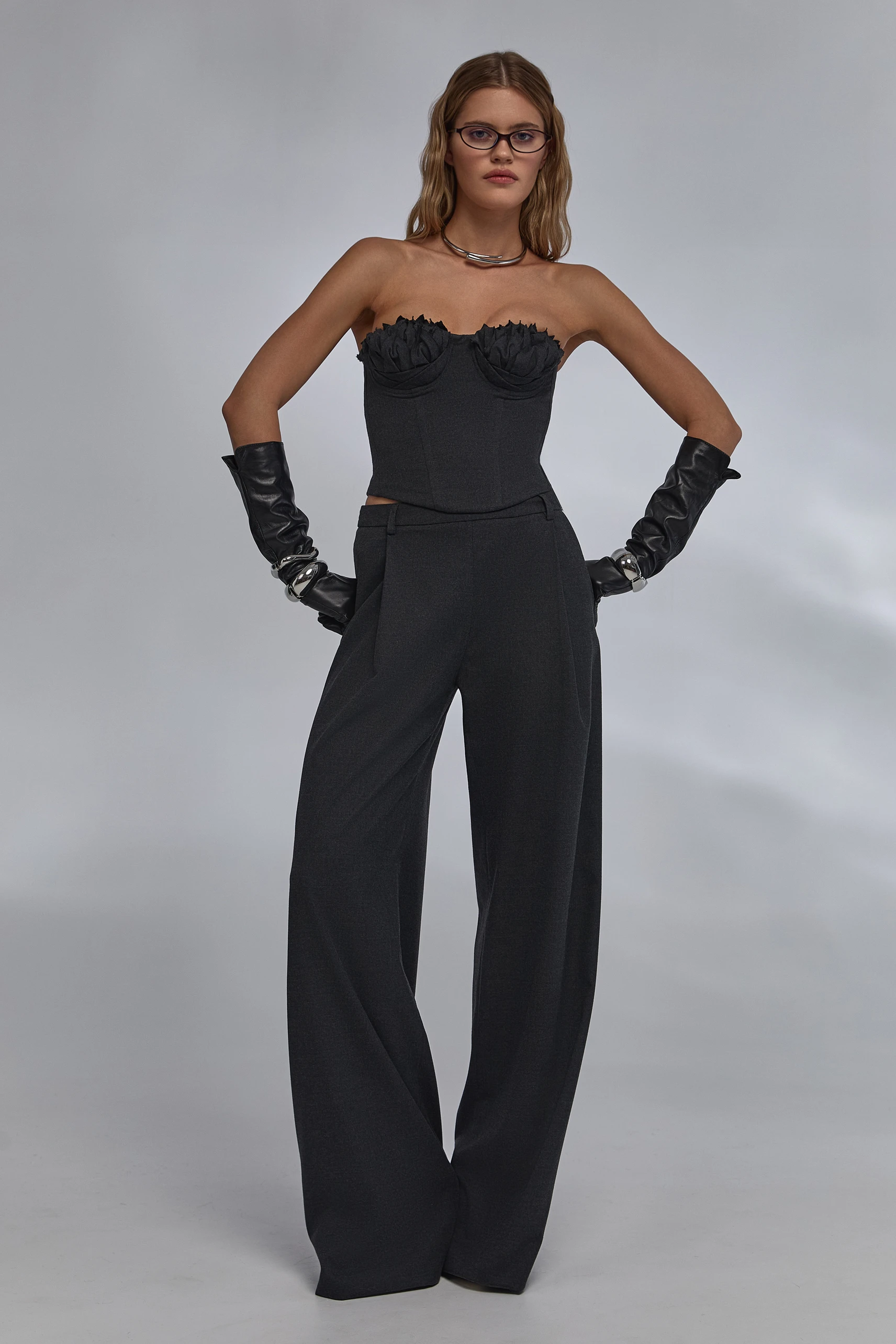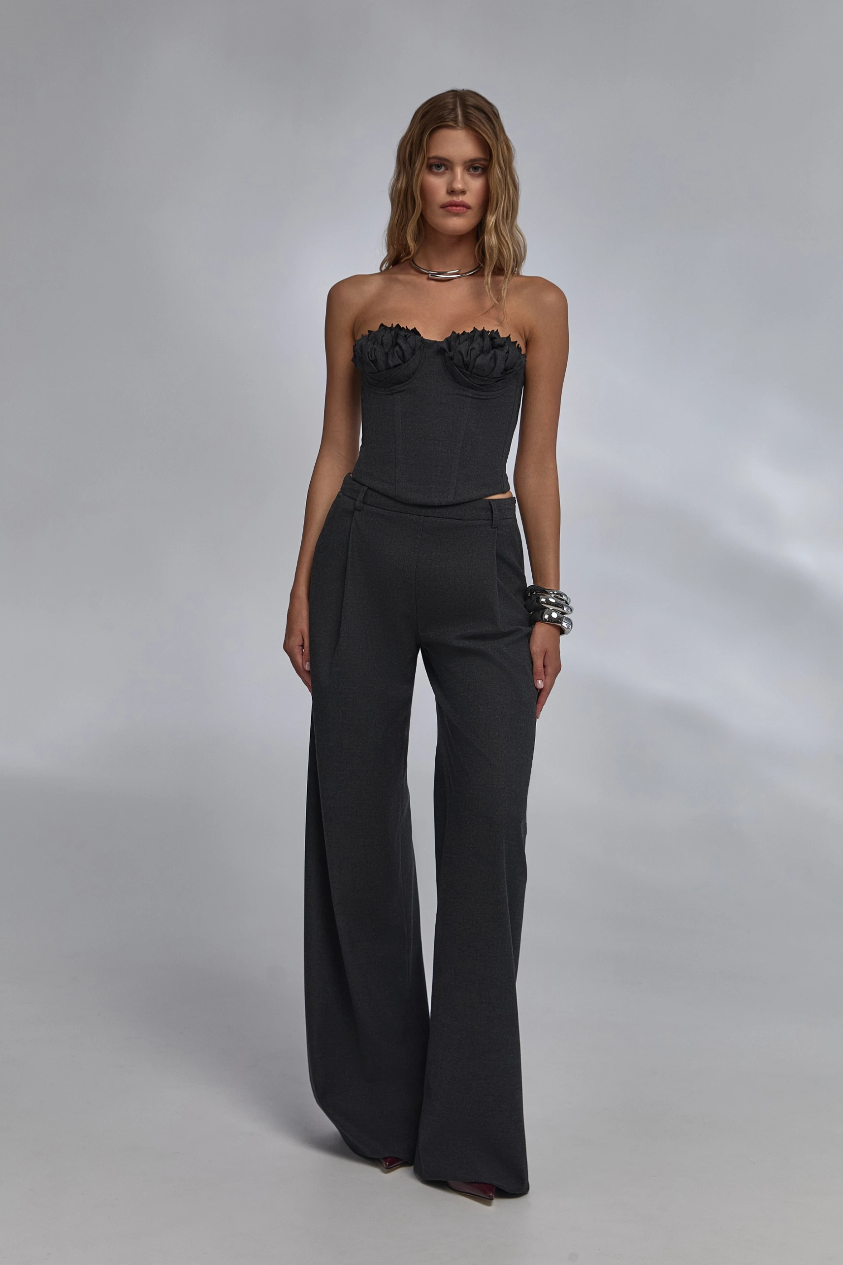 Артикул: w-set2floral/aut25/-xsСобранный дуэт контраста форм и комфорта. Корсет в глубоком чёрном с графитовым отливом выстраивает чёткий верх силуэта: чистые линии, открытые плечи и объёмный лиф с флоральной ручной отделкой акцентируют зону декольте. Брюки slouchy wide-leg уравновешивают образ мягкой линией бёдер и широкими штанинами, визуально вытягивая фигуру. Заниженная талия задаёт актуальные пропорции и поддерживает многослойность.