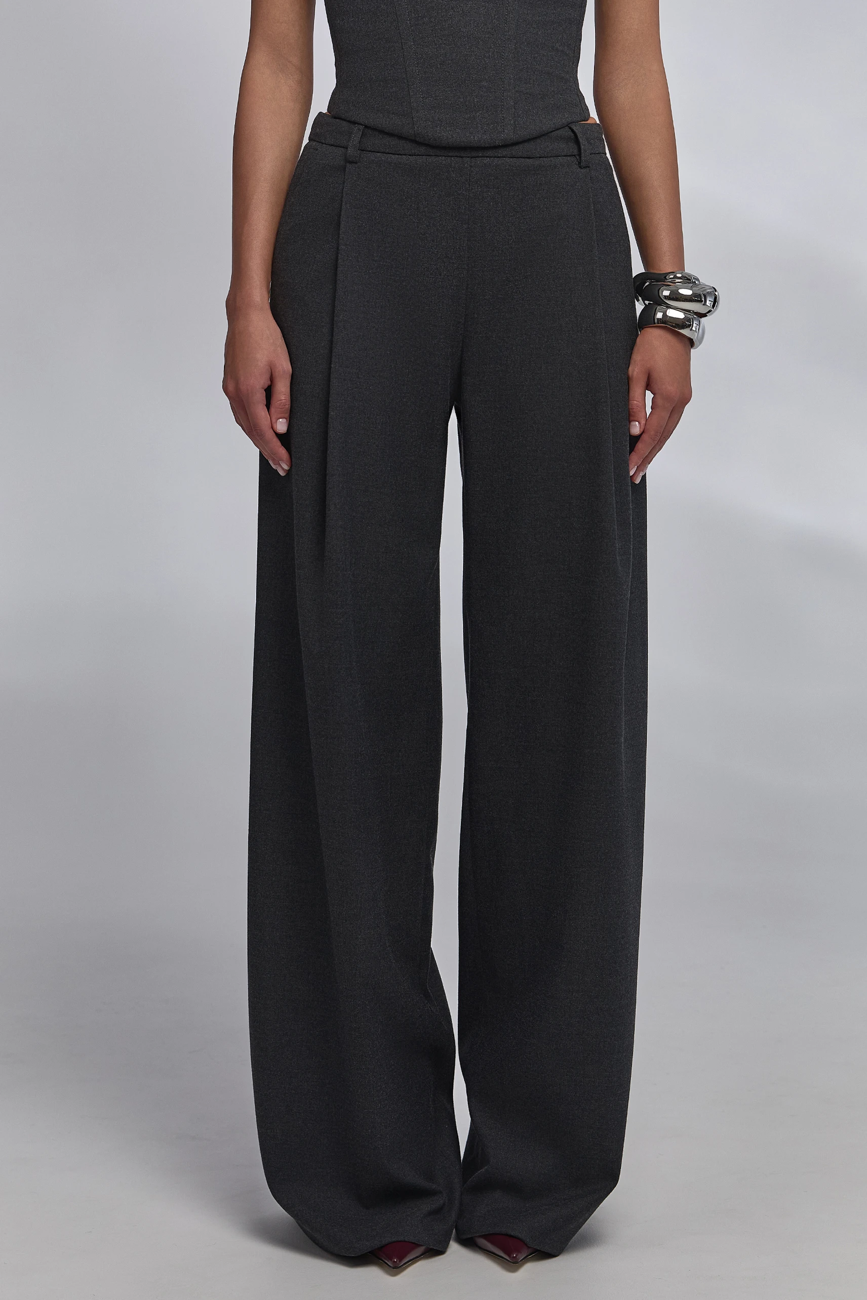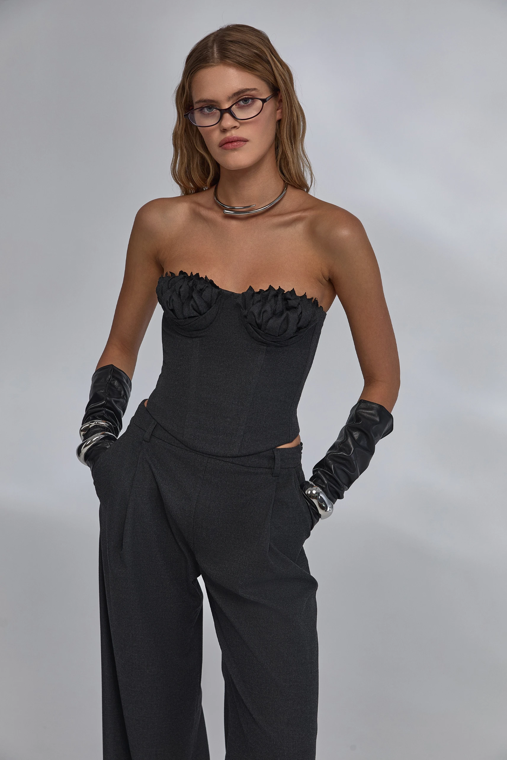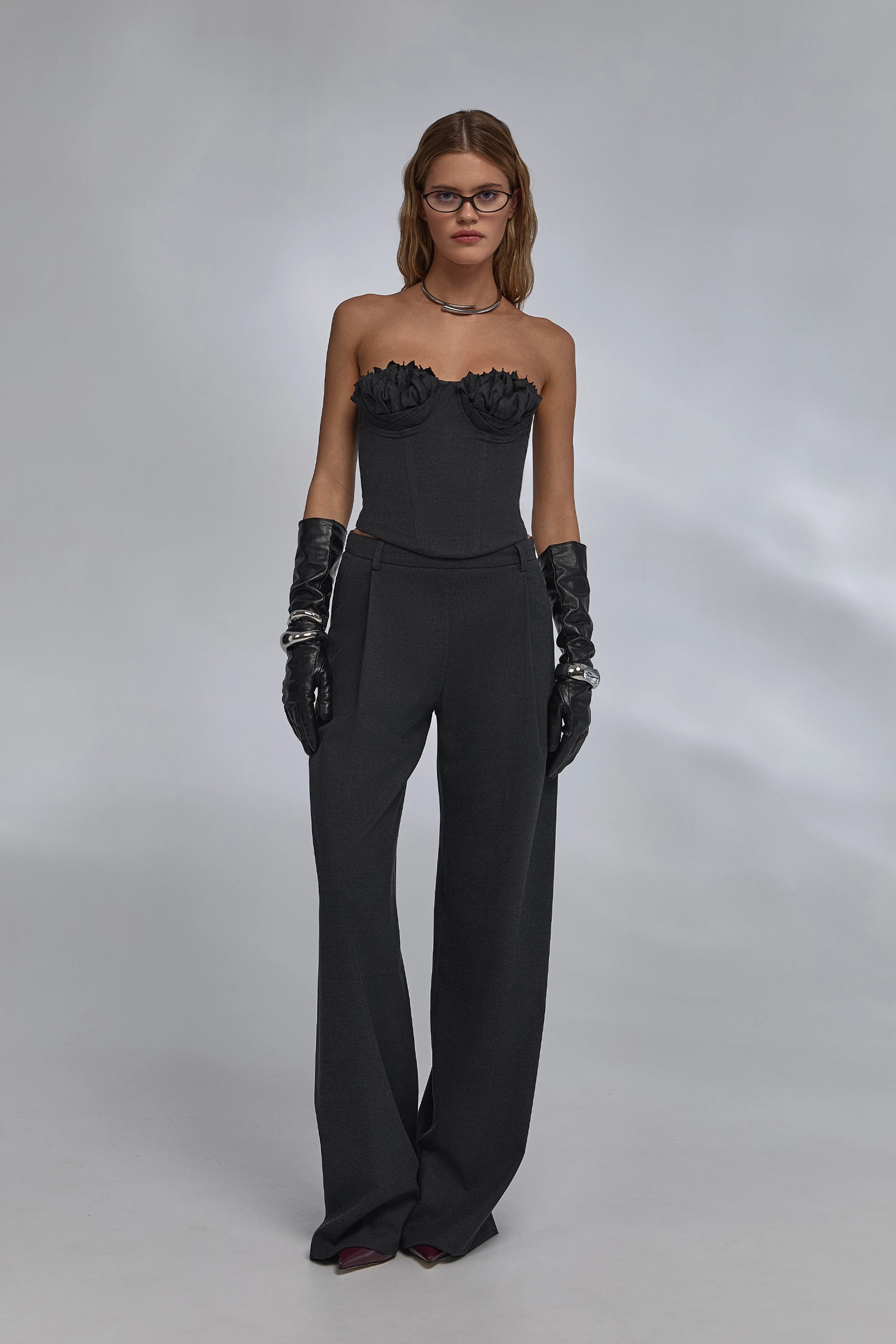 с приталенным жакетом — для строгих ансамблей; с длинным пальто — в многослойных городских образах; вечером — с лаконичными украшениями и обувью на каблуке; по отдельности: брюки — с базовыми топами и рубашками, корсет — с прямыми брюками или миди/макси-юбками.