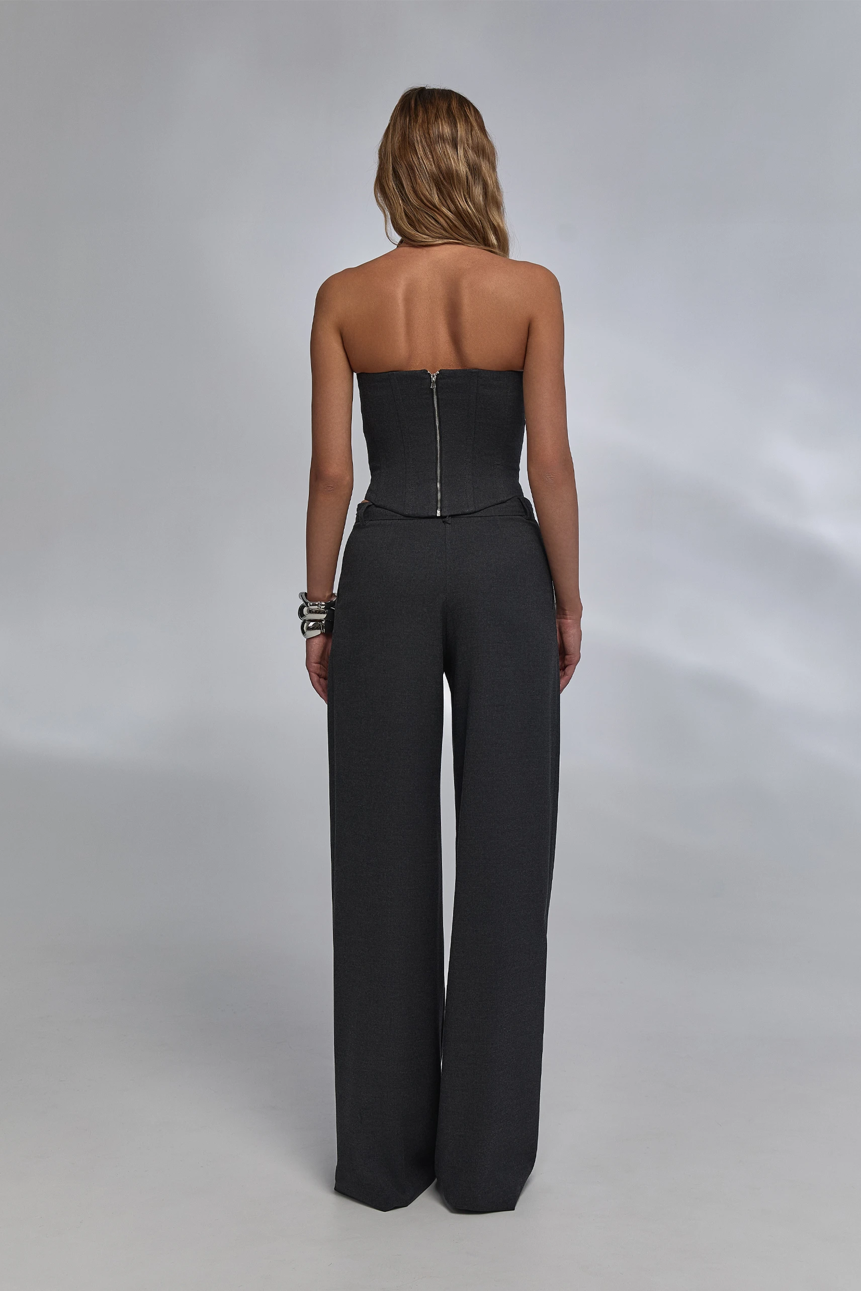 Материалы работают на посадку и удобство: плотная, но эластичная основа корсета фиксирует форму без жёсткости; технологичная ткань брюк пластично драпируется и не стесняет движений в течение дня. Комплект легко адаптируется под сценарии «офис → вечер» и носится как вместе, так и по отдельности.